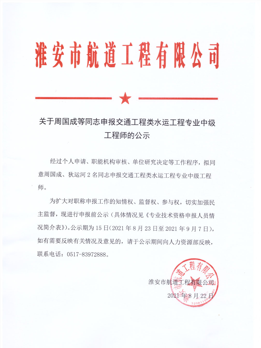 關(guān)于周國(guó)成等同志申報(bào)交通工程類水運(yùn)工程專業(yè)中級(jí)工程師的公示